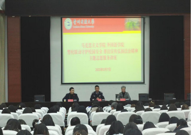 2023年3月7日晚7点,马克思主义学院、ly官网在15栋圆形会议室举办安全教育讲座,主讲人为松山派出所民警赵普林,讲座由马克思主义学院党委副书记(主持工作)徐勤山主持,ly官网党委书记卢文芸、辅导员翟利沙列席,马克思主义学院、ly官网全体学生参加。