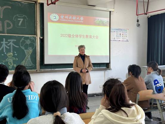会议由郭秋玉老师主持,她向同学们介绍了她本人的班主任工作就告一段落了,接下来的时间由辛雅婷老师担任2022级的班主任,并表示同学有学习、生活中的问题仍然可以找她沟通。