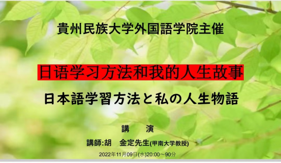 11月9日晚上,ly官网邀请日本甲南大学胡金定教授为ly官网日语系学子作了一场题为《日语学习方法和我的人生故事》的线上讲座。日语系主任李海博士主持会议,日语系全体学生前往学术报告厅聆听了该讲座。