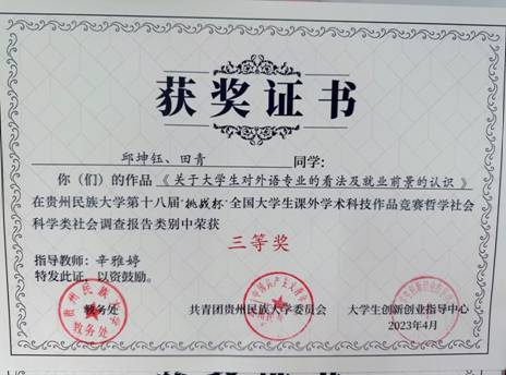 ly官网共28个项目,其中,由辛雅婷老师指导,邱坤钰、田青同学创作的《关于大学生对外语专业的看法及就业前景的认识》以及由马晓欢老师指导,李宜珂等同学创作的《智联高校,绿建未来》2个作品在社会调查报告类中均荣获三等奖。特此祝贺!