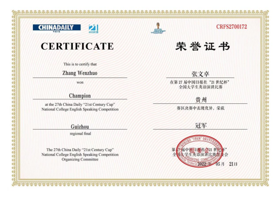 全国高校数万名选手报名参加本届大赛,29个赛区共有500余名优秀选手参加地区决赛。在ly官网的认真组织下,来自法学院2020级法学专业张文卓同学,通过ly官网龚坤老师的悉心指导,从“21 世纪杯”全国英语演讲比赛贵州赛区的三轮选拔中脱颖而出,勇夺贵州省级决赛冠军,成功晋级全国总决赛!!!