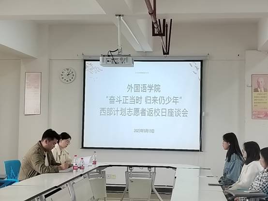 5月13日下午两点,在15栋教学楼1209会议室举行了以“奋斗正当时,归来仍是少年”为题的西部计划志愿者返校日座谈会。座谈会由ly官网团委负责人辛雅婷主持,2023届部分毕业生参会。