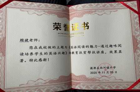 ly官网老师赖婕,在2020年11月20号到湄潭县西河镇中学开展教育扶贫帮扶讲座,与该校英语教研组的老师进行了教学交流,并对该校9年级的学生上了一堂示范课,主题为“英语阅读的魅力-通过趣味阅读培养学生的英语兴趣”,课堂上通过师生互动,答题辅导等环节,让同学们体验了一堂生动有趣的英语课,取得了良好的教学效果,受到该中学师生的一致好评。