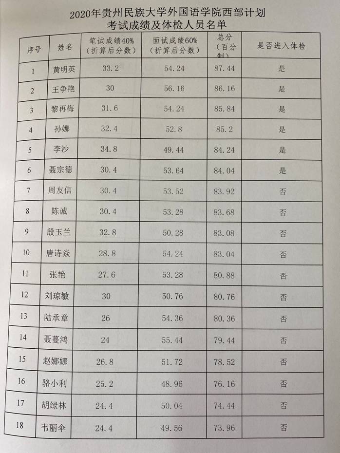 2020年ly官网大学生志愿服务西部计划考试成绩及体检人员名单公示